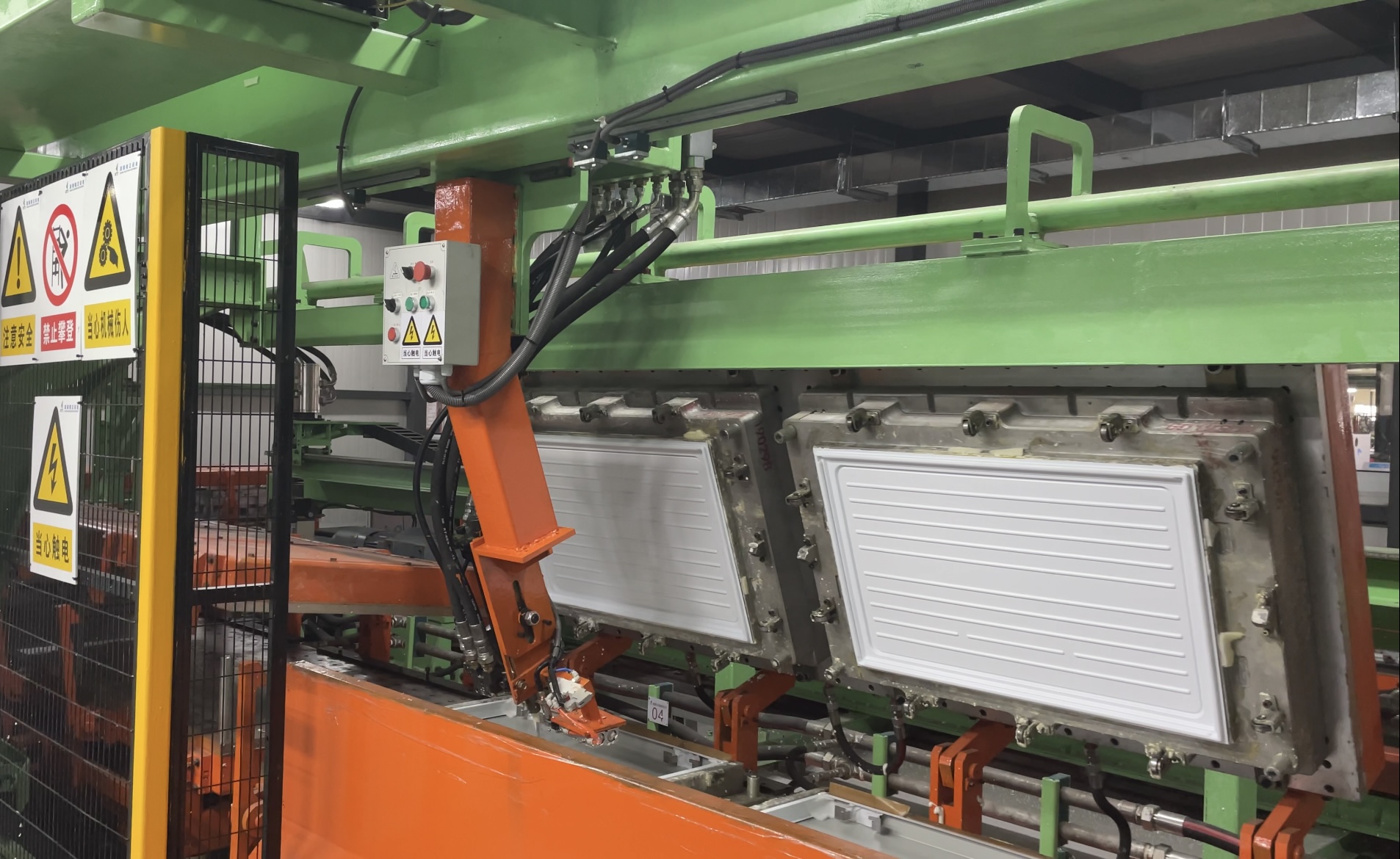 全自动冰箱门体发泡生产线属于环形式门体发泡生产线,为水平地面环形结构布置,采用自动浇注,自动取件,可不停线生产各种不同型号的冰箱门体的发泡,多种产品可在线上混线生产,线体运行速度可自行调节,大大提高生产节拍,其中链轮驱动,机械开模,机械合模的稳定结构,减少了设备的故障率。